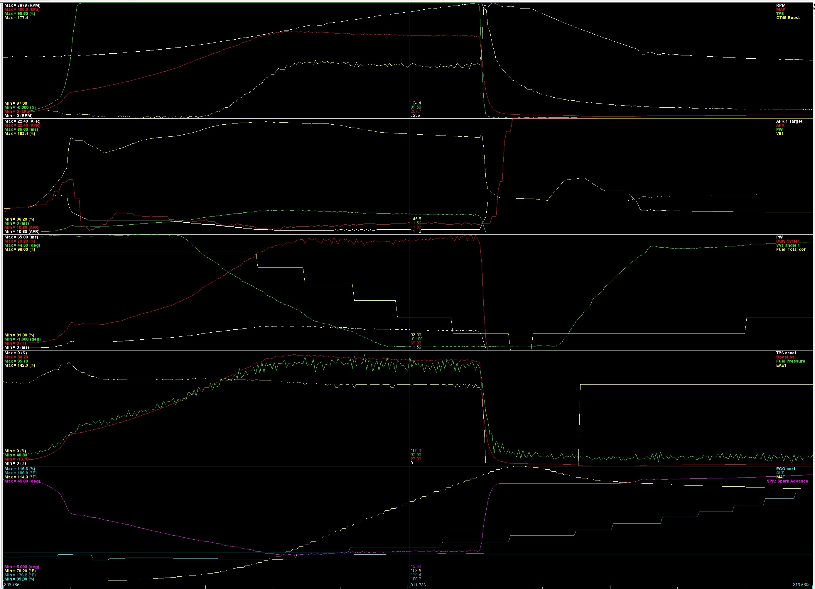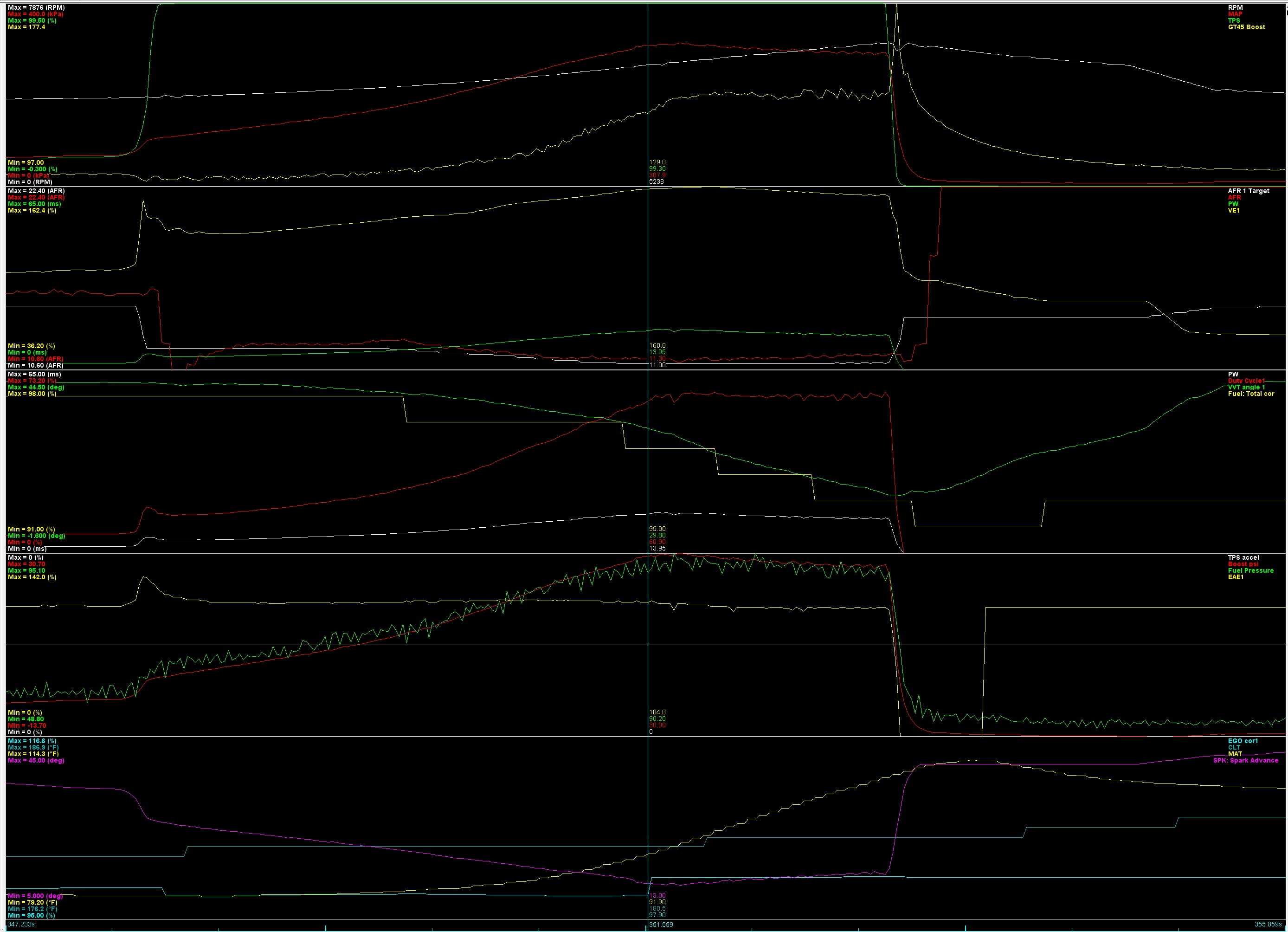 For the front turbo, the EBC is setup to deliver 24 PSI over the rear turbo, so with the rear at wastegate that should hit 24+4 = 28 Total. It spiked to 30 though so I have data for that!