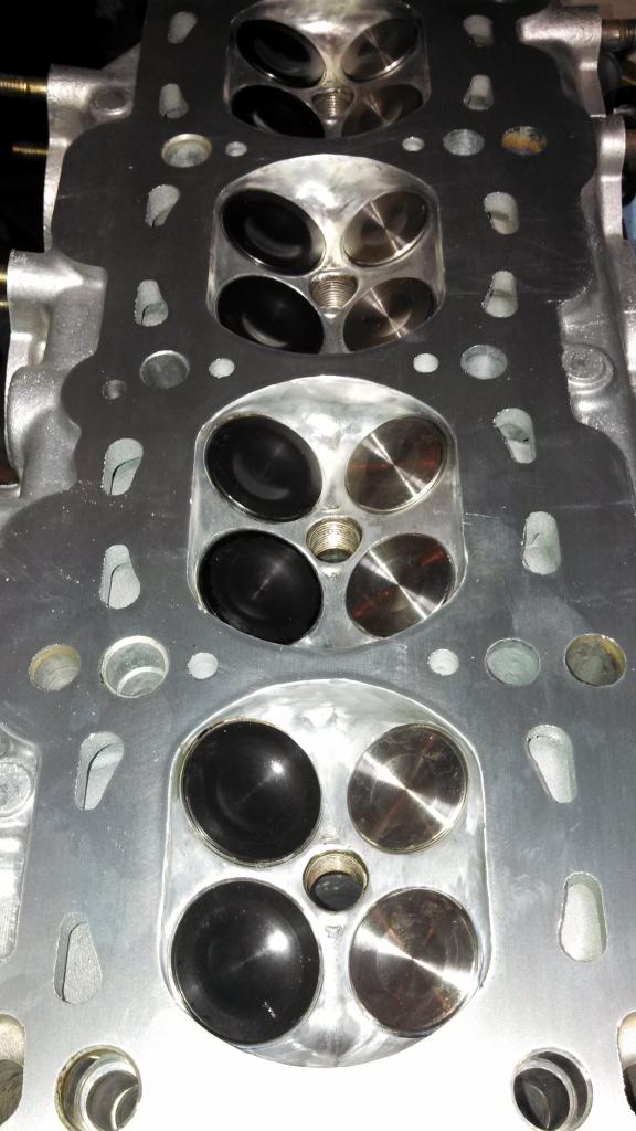 Fancy Supertech valvetrain, intake valves, +1 Inconel exhaust valves, titanium retainers, dual valve springs, 5 angle on the intakes, 4 on the exhaust, surfaced flat to <10 RA surface roughness, ported, deshrouded, bowls blended to seat/combustion chamber, polished combustion chamber. I did all the head work, just bought a Newway seat cutting system and built a valve grinding machine for tipping the valves to adjust them. It’s revved to 8700-8800 and not broken, so at least this part of my old engine did ok! Note: don’t rev a boosted BP to 8800 with rods-only bottom end and expect it to last…. Or probably any BP engine…