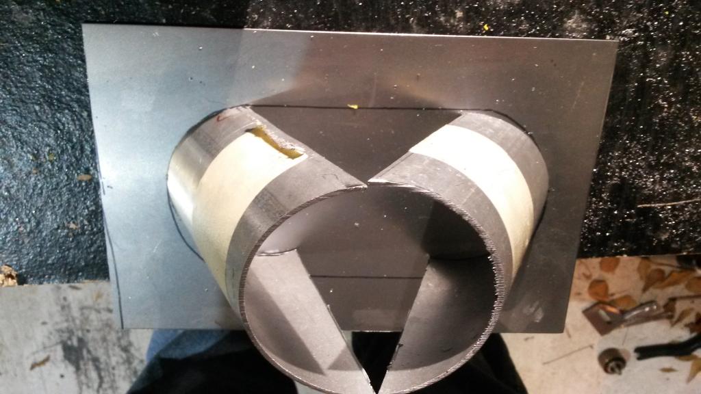 First, took some 3" tubing, cut ends at 28* angle vs square, with Length of 4.53" then on one end marked it in the middle, other end, added 1.5 cm to it, drew lines, cut.