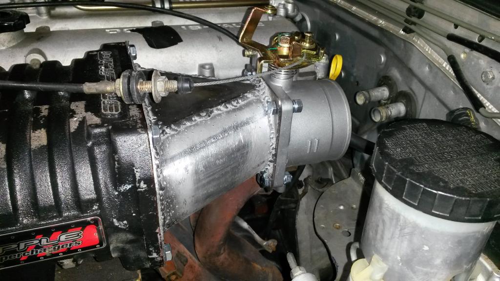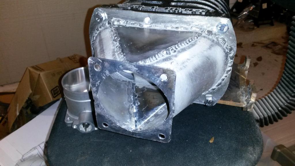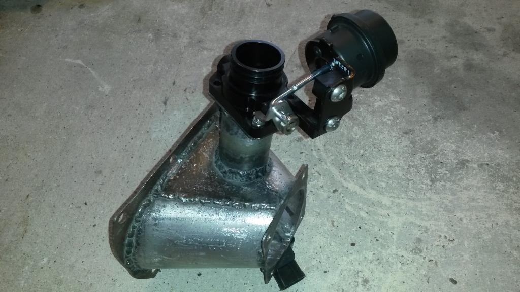 So took me over an hour to find a place for the bypass valve. About 2 hours. it needs to coneect inlet and outlet of SC, less pipe is better, but SC next to header... and can on actuator is plastic so it needs to be away from header. Finally figured out a spot, basically 3/4" away from flange, on the edge, angled 20* from vertical towards drivers side, then twisted at an angle... It fits, hits nothing, can is away from heat. Now waiting on 1.5 to 1.75" 90* silicone transition before I cut and weld the final piece on to complete the bypass.