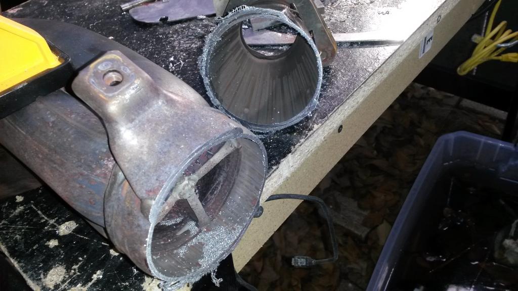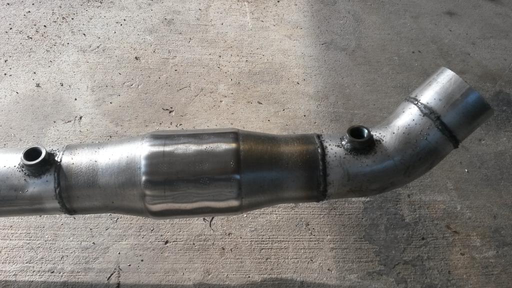 This is 3 pieces tach'd together. At this point, it wouldn't fit in the car as one piece. I decided to cut it in the middle and clamp it back. I already had a split clamp I intended to install once it got down under the car, but since it didn't want to play nice (fit in the car) I put it in the middle of the downpipe.