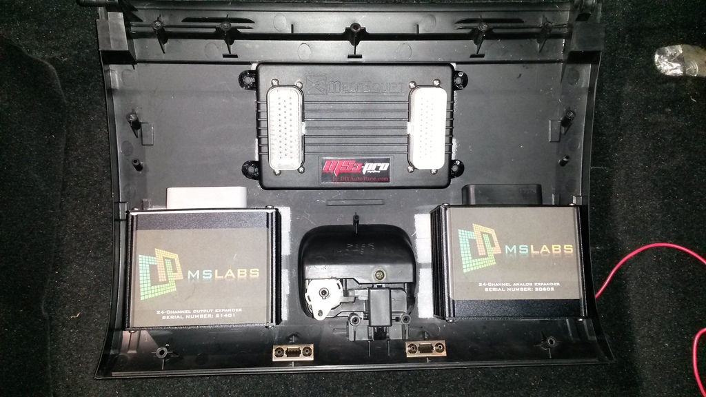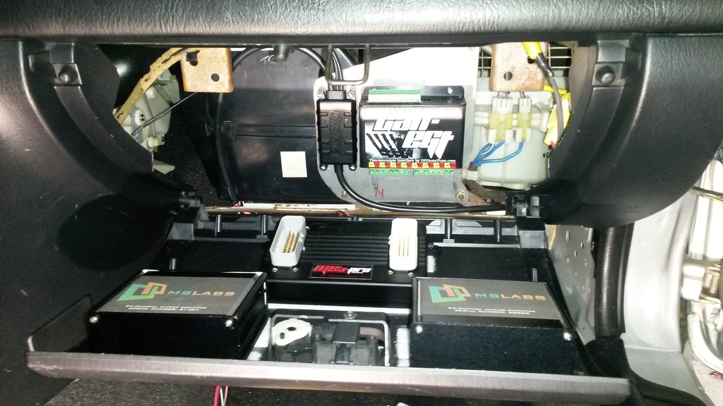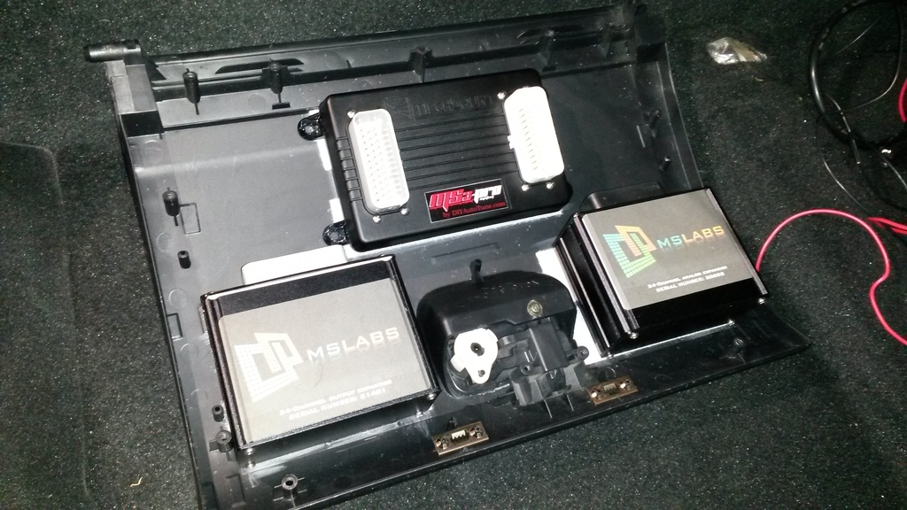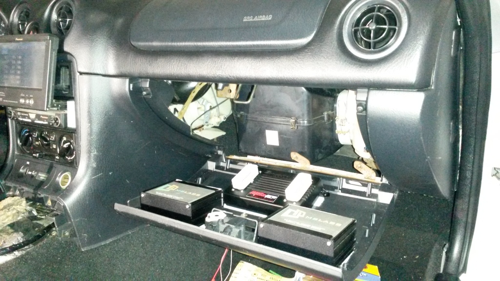 Today, I have so far gotten the electronics that are going in the glove box area mounted. Behold!