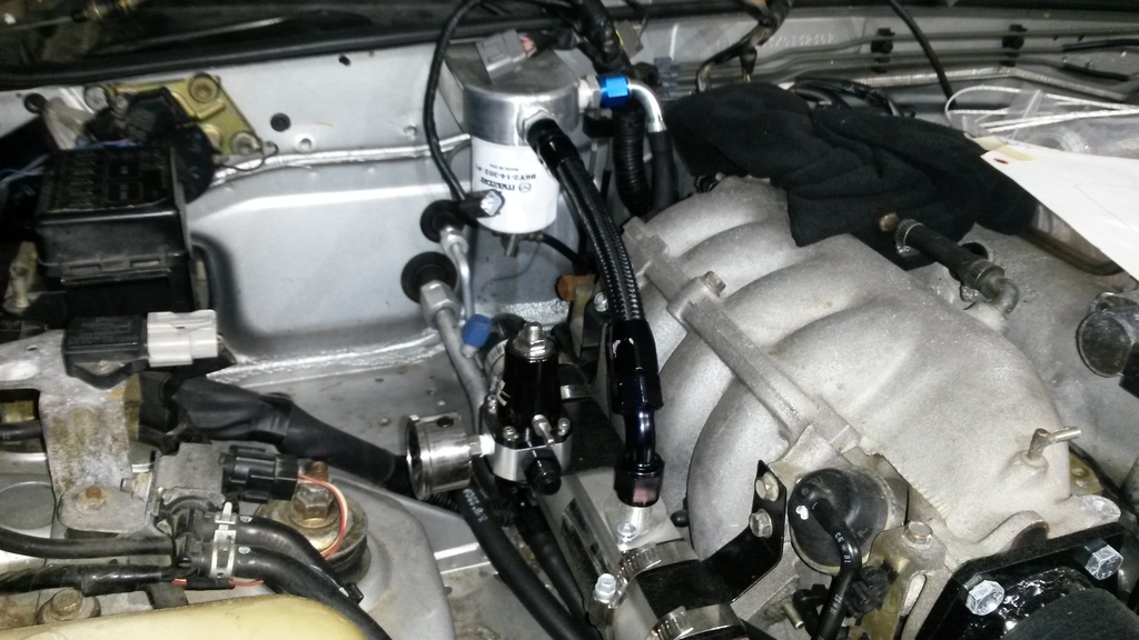 Anyways... I got a lot of little things done. Installed oil cooler hose with heat shrink over braided nylon, torqued all fuel fittings/oil fittings, installed lower intake manifold, installed emissions equipment/vac hoses, Installed exhaust system., bought fuel for the car, added it, set fuel pressure (more on this later), installed thermcouple in lower radiator hose, bought oil for engine, installed valve cover w/new gasket, VVT bolt/crush washer.