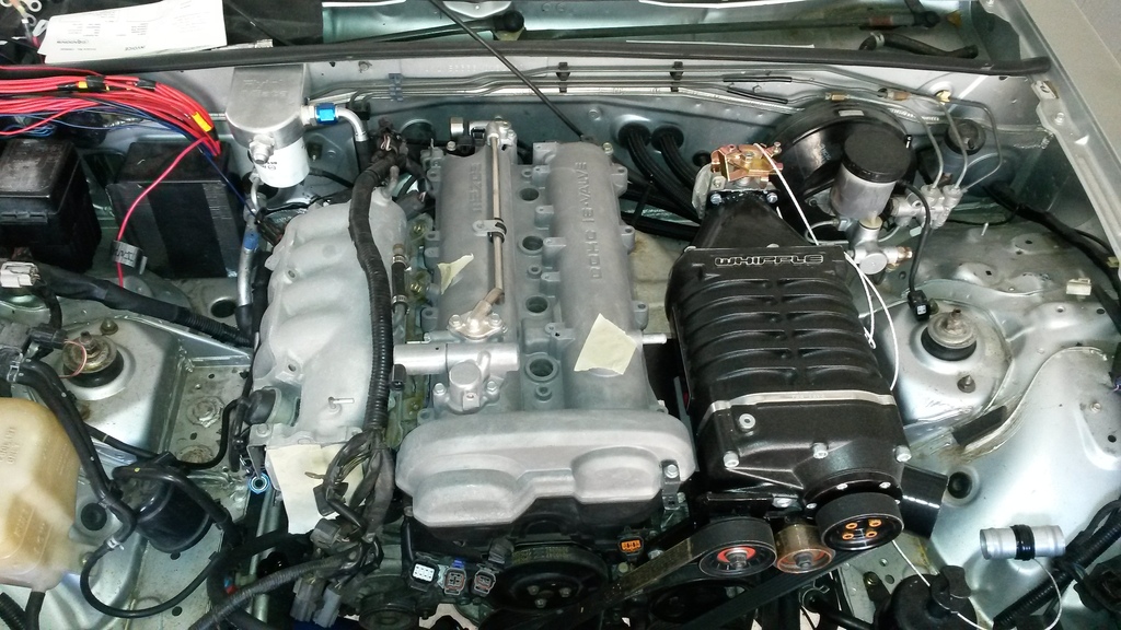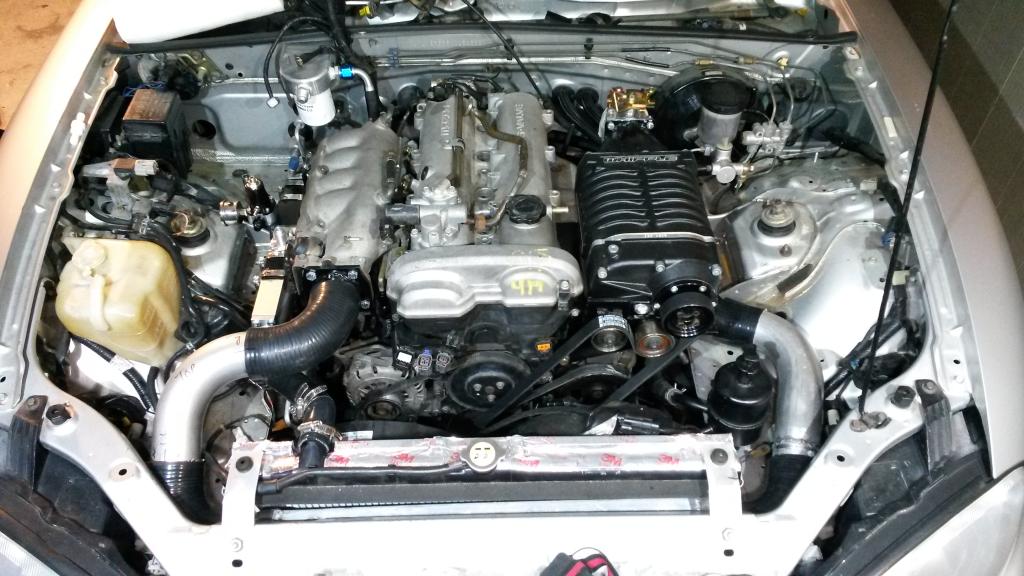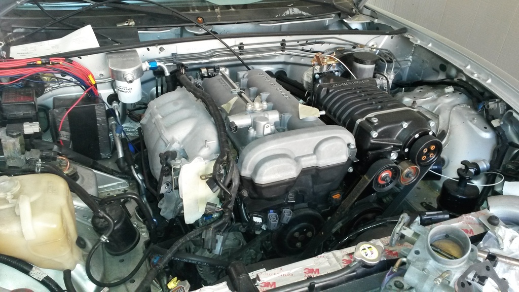 See pics, got a bit more done. Bought some wiper blades for the car too. Might see if I can get it running on friday with the stock ecu/no SC. Thinking about doing that to make sure all the stock wiring/sensors work before i mix them into my complicated wiring harness I'm about to build. Also could go get the inspection done too, and get it legal. I'm waiting on a few stock parts to show up. But I was just thinking that IF I could get it running friday, I MIGHT could take it to the drag strip that night! Probably a longshot, but who knows! Wouldn't be fast on stock ecu, but would be a lot more fun to run than my C63.