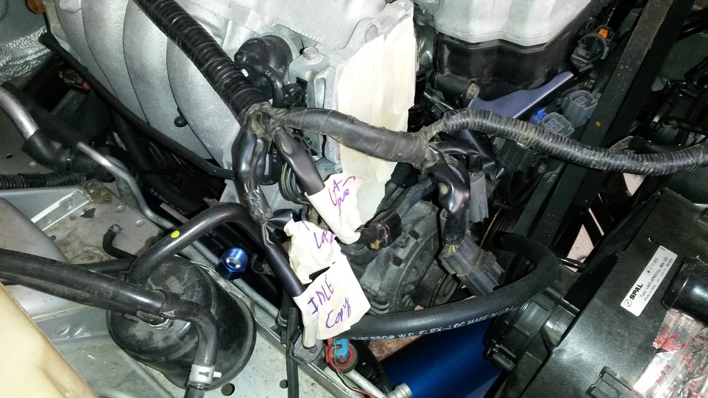 I started on modding the factory wiring harness. Basically I will relocate the IACV since SC, so added another connector for it at it's new home (rear of engine). Kept stock plugs for stock purposes. Also did same for TPS. And added 6 wires for 01+ COPS, kept 99' connectors incase I need them ever. Also added new wires for MAF incase I decide to put it in down the road.