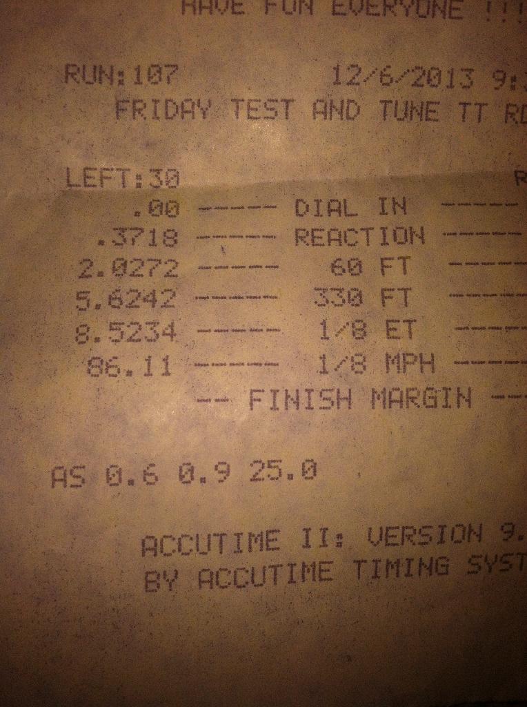 I'm on a 12psi wastegate spring, running real rich in boost and a few degrees of timing pulled out of it. It still ran 8.5 @ 86. I was really happy with the time, I figure that's probably enough to get me in the high 12's through the 1/4 and I expect there's another +100hp on the table once it's all said and done.