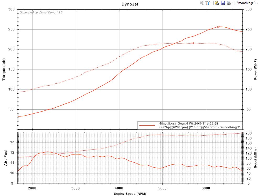 You can see boost on the virtual dyno a couple posts up, it's hitting 13psi at ~4600rpms. It feels fine driving around, but I feel like it should be coming on a lot earlier. Right now I don't have a boost controller on it. I put one on about a month ago and it didn't help.