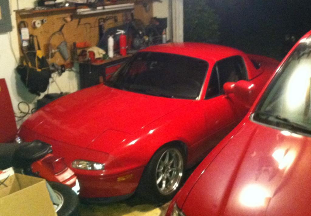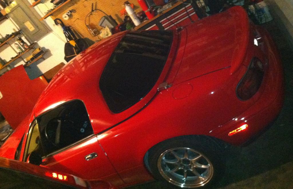 I picked up my hardtop and spoiler yesterday from being painted. They came out great... so nice that now the rest of the car looks like crap, but at least I saw that coming. It was dark by the time I made it home but I took a couple crappy pics in the garage.