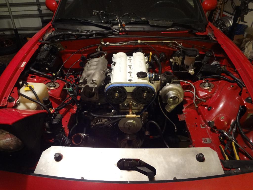 Also have to figure out what I'm going to do with the exhaust. My Artech downpipe was set up for a separated gasses internal wastegate. The new turbo has an external wastegate on the turbine housing. With the current downpipe there's no room for the wastegate dump, which I was planning to run for a while just to get it back on the road. I'm hoping I can just cap off what was the internal wastegate and tie the external wastegate back into the exhaust, but I guess there's no point in worry about it until the car runs. For now, she'll stay hoodless with the wastegate out the top.