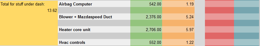 I removed all the stuff under the dash, it came out to 13.62lb, which is less than I had hoped, but I don't use that stuff anyway: