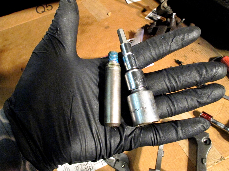 So, then I realized that I had to swap the slider pin from the old brackets to the new brackets. Due to the holes being filled with brake grease I didn't notice the hex hole at the top (first look). I knew the slider pins were threaded and did a quick google search. It didn't help .... or.... maybe I got sick of surfing google on my phone through forums. So I went back to the bracket, wiped it down and noticed the hex hole. Here is my breaker bar hex key removal socket. I look at this in my hand in the garage and in my head xzibit says "I hear you like adapters so we put an adapert on your adapter on your socket on your hex key."