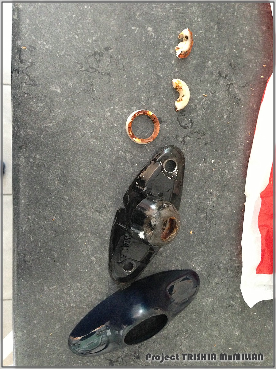 The white/rusty thing is supposed to be half a plastic ball and was in my case totally broken by the rusty screw inside.