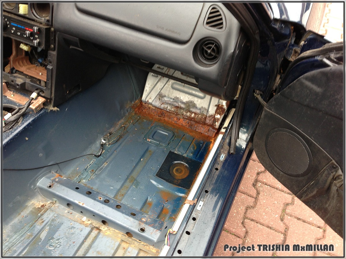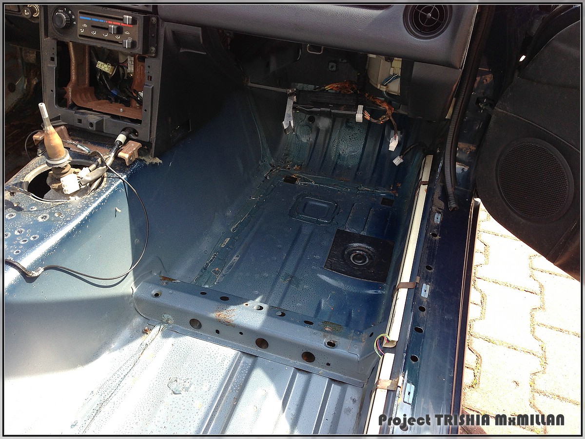 First thing was to cut and throw out the floormat on the drivers side - the torn roof left a puddle of water and some rust there - but luckily the picture makes it look worse than it really is...