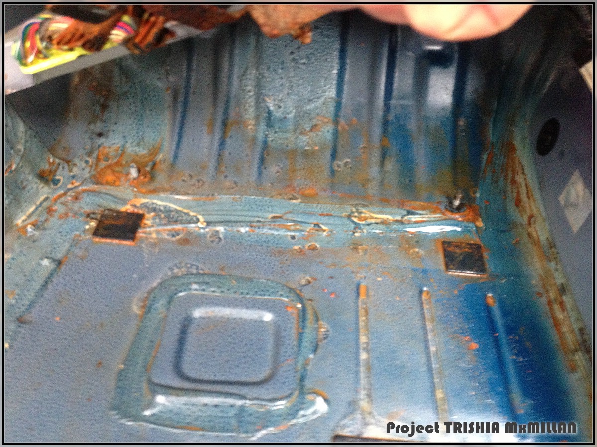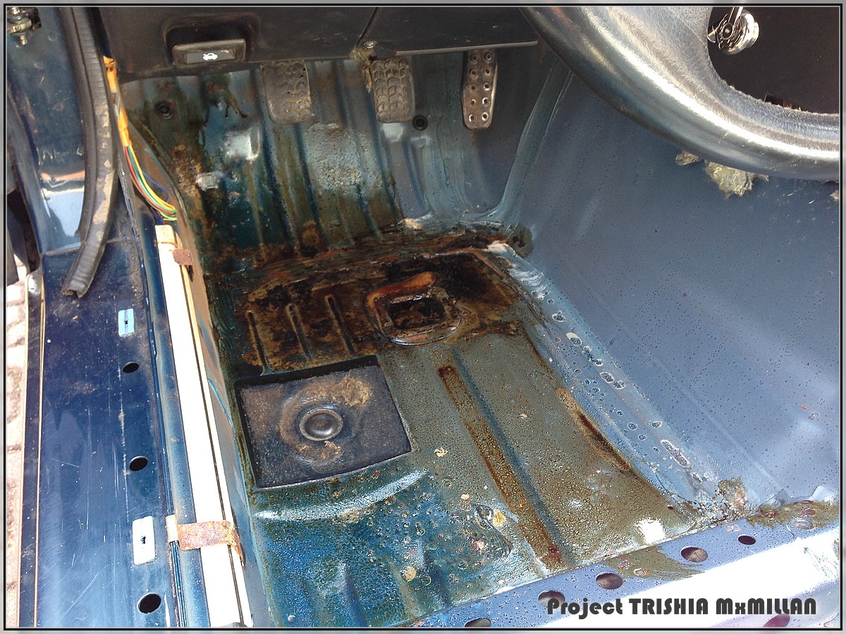 Passenger footwell cleaned, wire brushed and treated with Fertan (rust stopper)