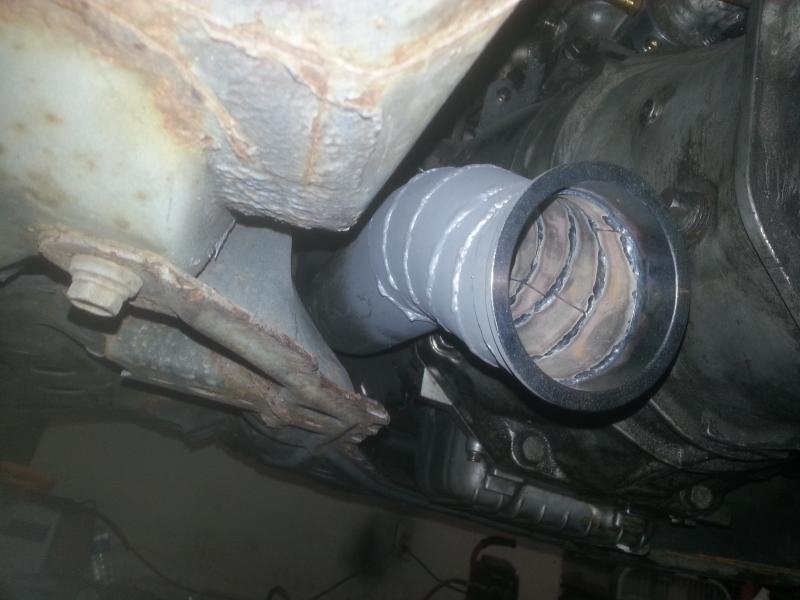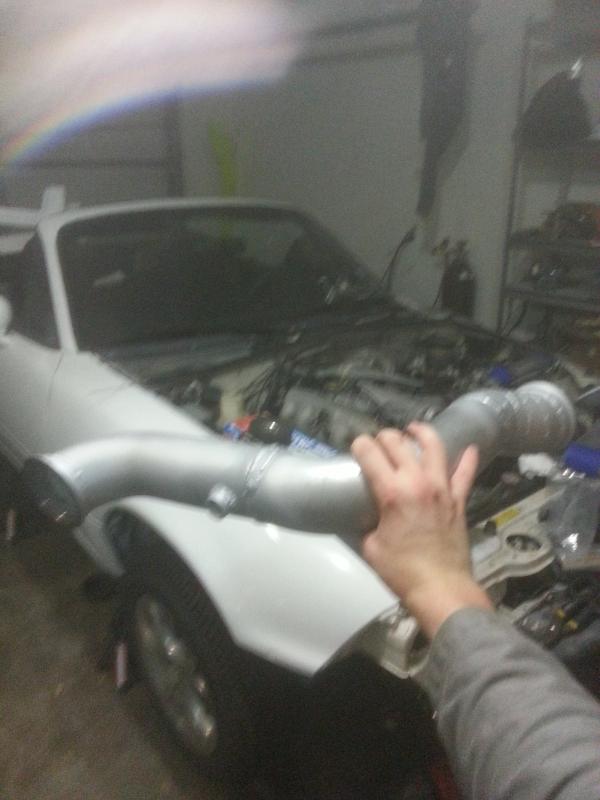 Forgot to post some pics from finishing working last night. With the help of roomate and a brass hammer, I was able to fit the downpipe back in and got it all bolted up.