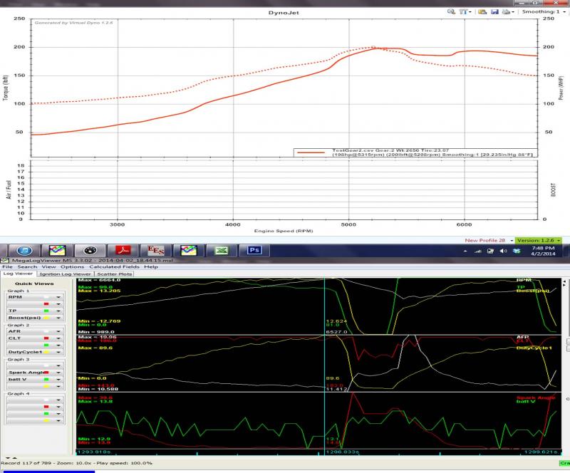 The picture is from a 2nd gear, I couldn't do much more than that. The car is running is very rich up top. ML says 11.1 but my gauge read about ~2-4 below that. I guess I'll remove some up top and actually try to keep WOT all the way to 7k. The pictures doesn't look too good so the number are 198whp/200wtq at 10-12 psi It's a fun program