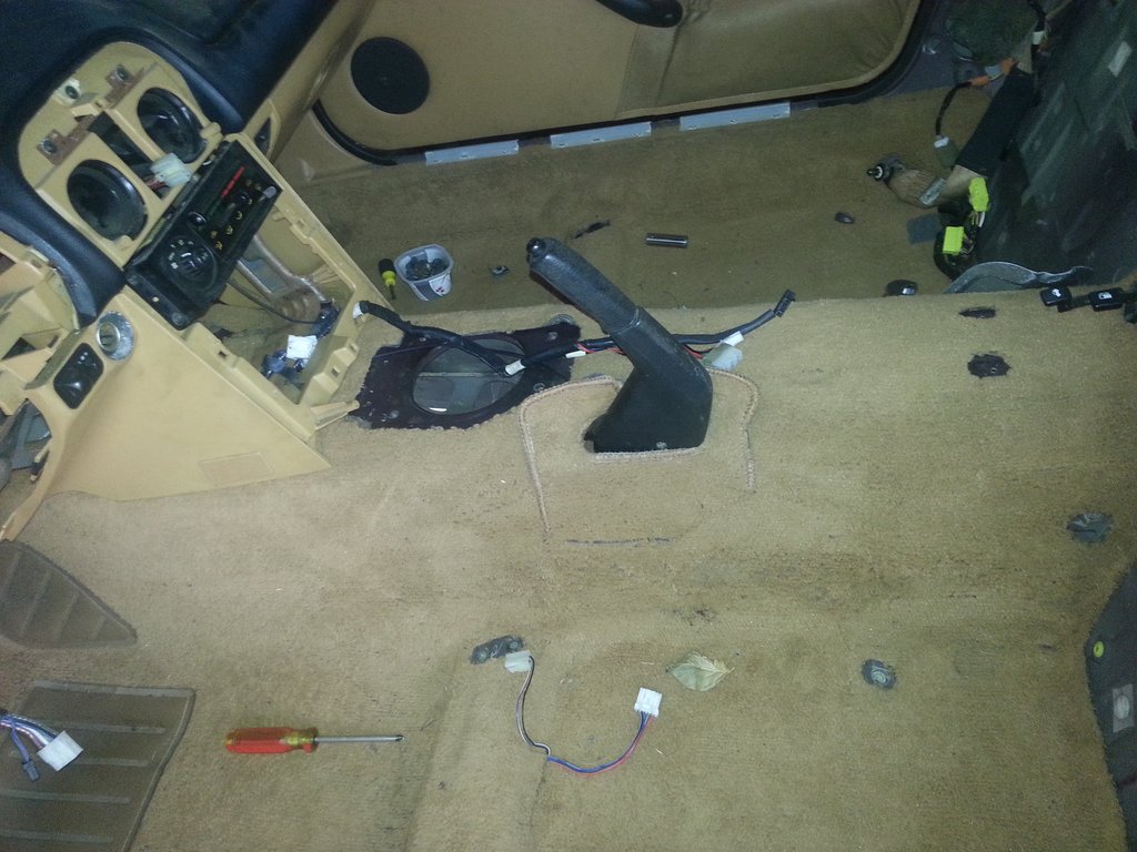 Installed wiring harnesses and bottom carpet.