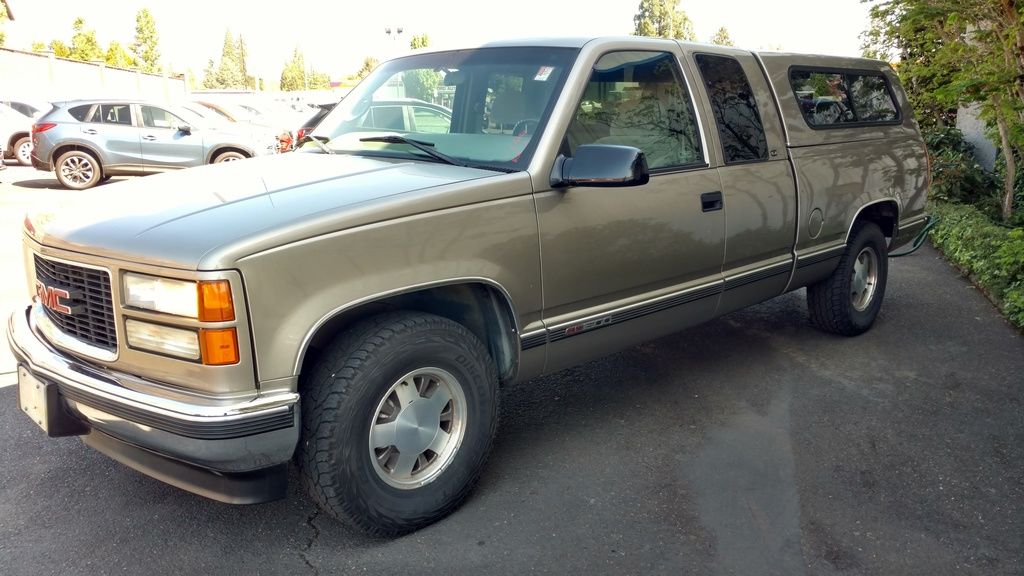 1998 GMC Sierra SLE 2WD. It's just the 305 V8 which was a bummer, but it's a one-owner, local owner, 165k truck in absolutely unbelievable condition, and I picked it up for a song here at work. I don't have to worry too much about the weight of the trailer to tow the Miata if I'm using this instead of the Sportwagen.