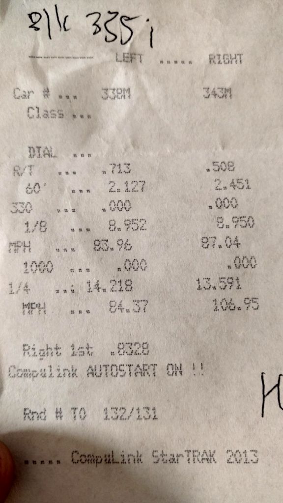 Yup. Looks like you really need to get that 60 foot down. Its got low 12's in it, maybe high 11's if you can get it to hook off the line. Drag radials will help with wheel hop alot. The only thing i like about drag racing is that its a good / safe way to run data acquisition under full load. For this reason its less about the race and more about collecting the data i need, making changes to the tune based on the data, and repeating. Cheap test and tune. If that's your goal then i wouldn't launch the car and run on your track tires. This will give you the most accurate data to get whatever it is dialed in.