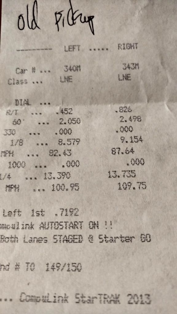 Best trap speed was a 109.75 (on a 13.73 second run):
