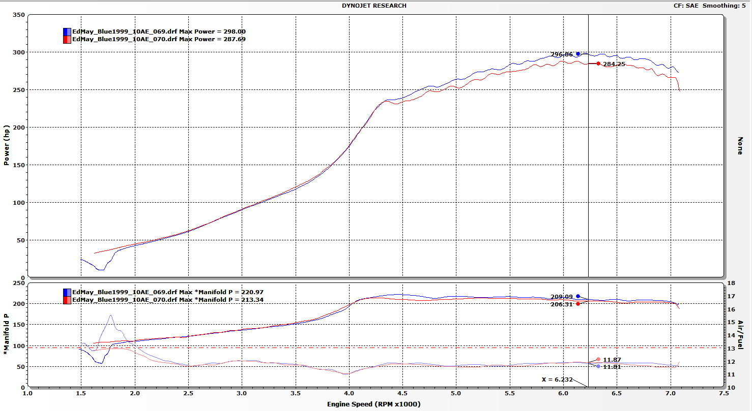 Most of the temperature corrections are taken care of with a correction factor added in. I don't have the latest dyno files for Ed, but last time he actually made 321 with correction. Ed's turbo is spooling right in the sweet spot of VVT usefulness, so it'll make a huge difference. But if the table hasn't changed since the last dyno, I'd definitely think something's happened. Either the turbo is wearing out, engine is wearing out, or something else in the fuel/spark map is different.