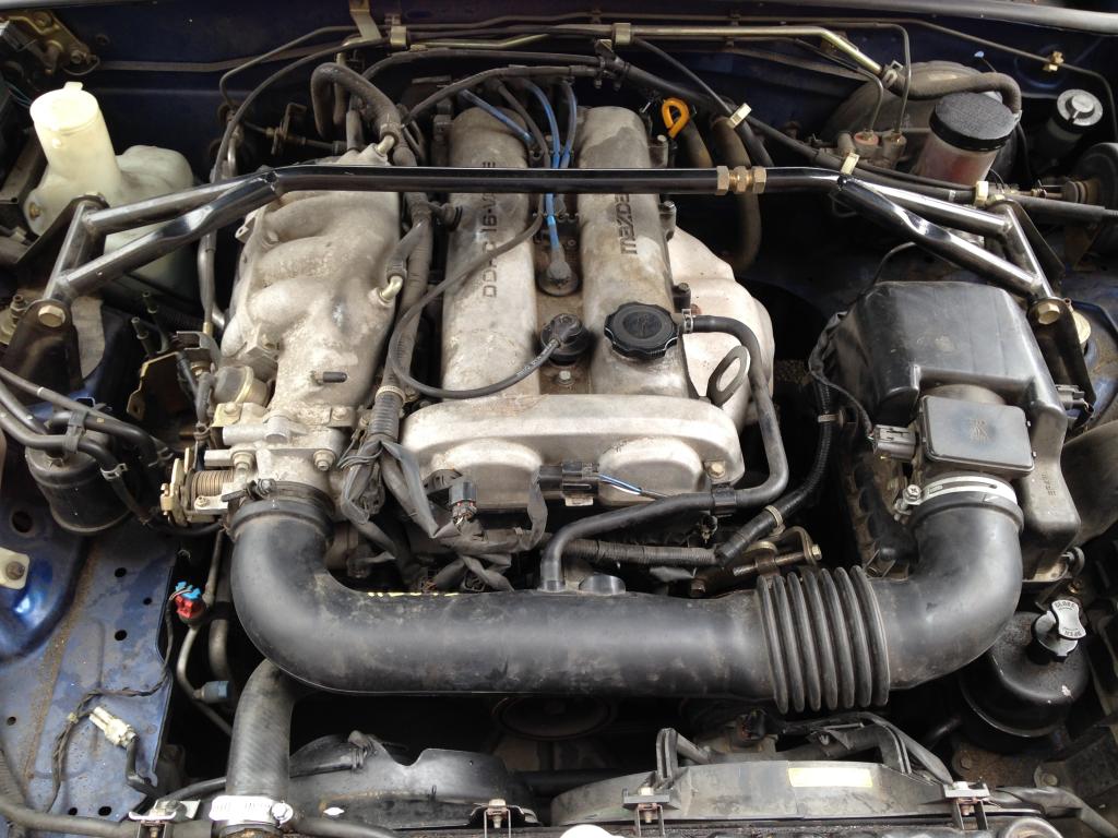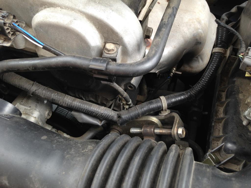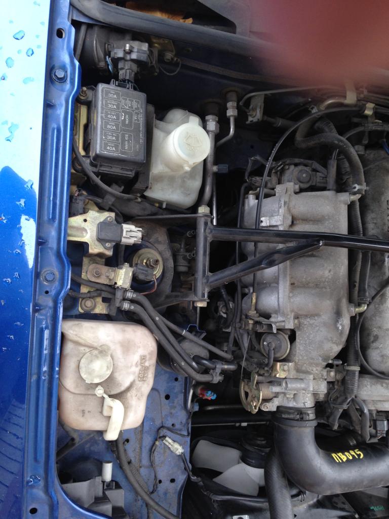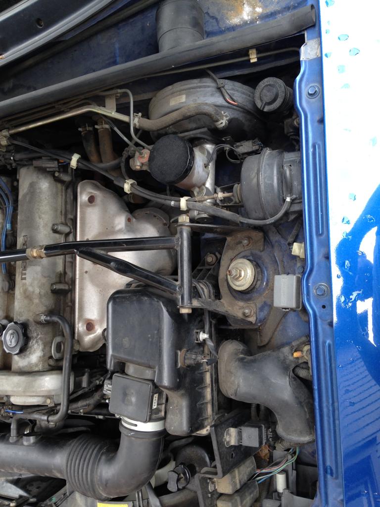Engine shot after Ed's $20 cross over tube. Please note the hilarious #1 spark plug wire. Ed's got some cheap NGK replacements on the way.