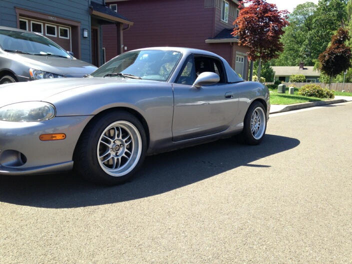 It's now sporting 6uls in the back with 225 RS3s, and wideopens with 205 Neo Gens in the front. Talk about a poor match. But I did a string alignment to get the toe a little better, so it's not so crooked now. I wouldn't be surprised if I was crab walking sideways with the bent spindle.