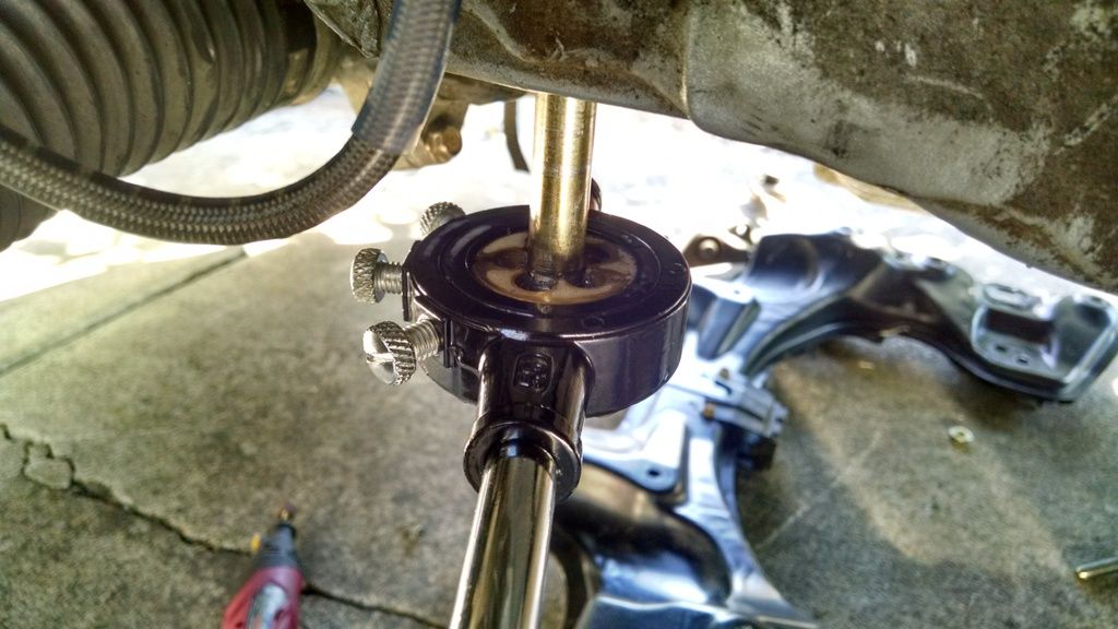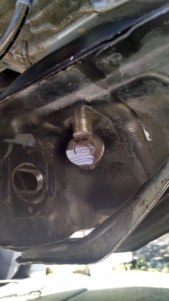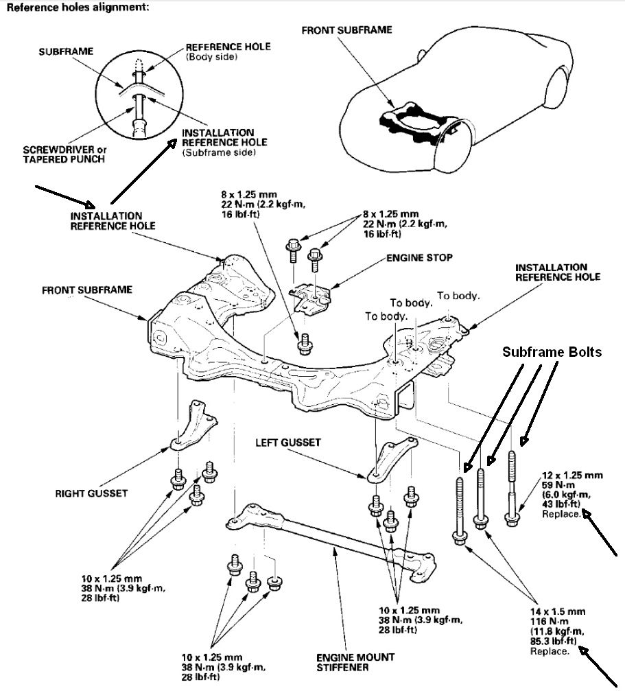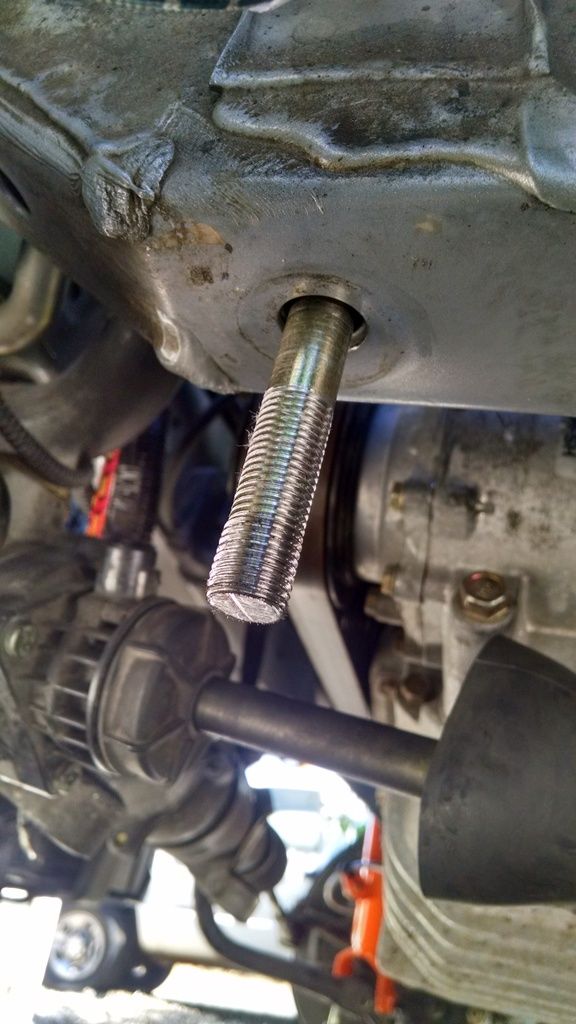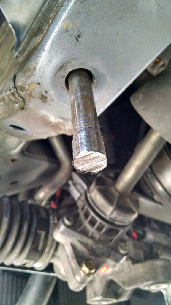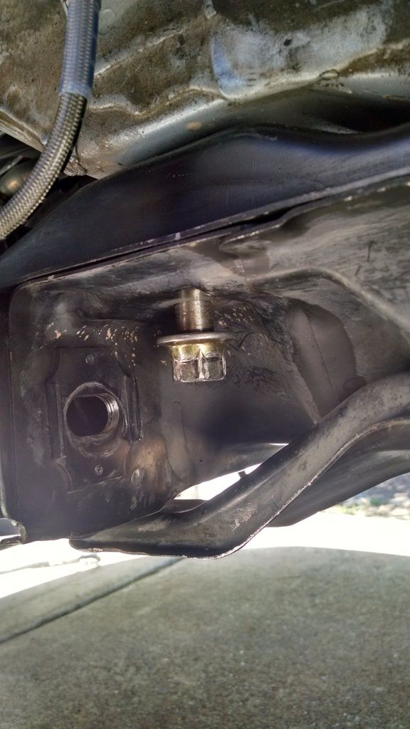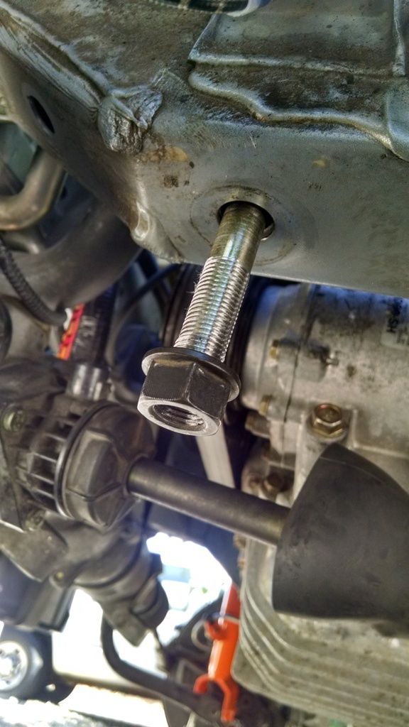 That's pretty dumb, but then I reached a whole new level of dumbassedness. I started tightening the bolts with a regular socket wrench, but then that bolt got really hard to turn. I knew it wasn't cross threaded and I was getting impatient, so I decided to put the impact wrench on it. MUHAHAHAHAHA!! It was tightening... Then I could tell the 'nut' inside the frame broke loose. Holy ****. OK, so I tried to back the bolt out... not happening. I'd wedged it in there. And obviously, since the threads didn't go far enough up the shank, it wasn't holding the subframe in.