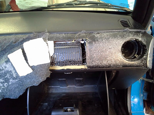 2: Previous owner had sticky carper material over dash, wanted to see what was under it since it was hideous and there was a square missing from the dash panel, no clue why but the guy ruined the dash so over a two or three day period I researched how to take out dash, took the dash out and started looking for another!