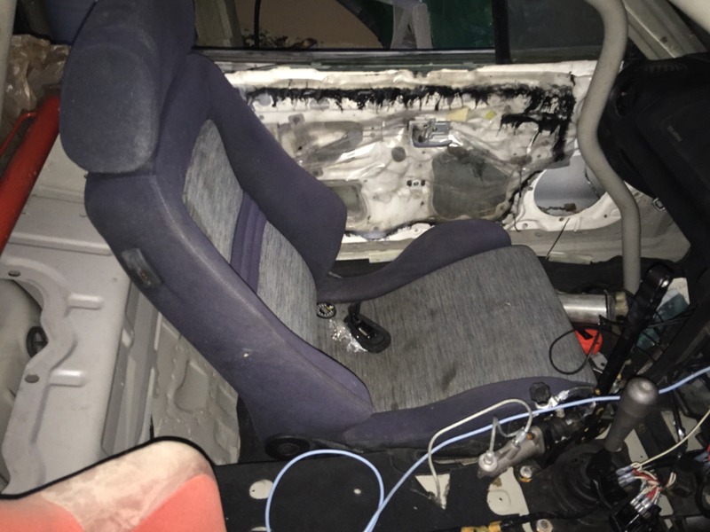 Mounted up the Evo 1 Recaro seat I had for the passenger seat. It can't go any further back due to the main hoop, if it weren't for that the seat would have another 3" of rearward travel. Bummer.