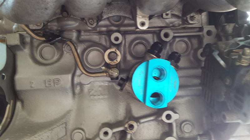 Oil cooler & filter relocation stuff. Also added the 4an adapter to feed the oil pressure gauge