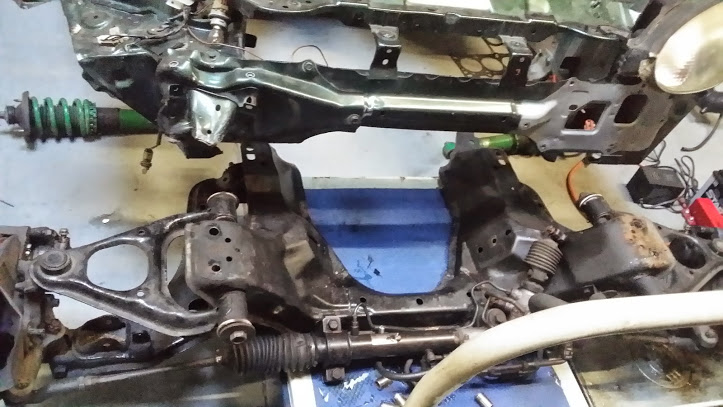 While waiting on the parts to come back, I spent last night tearing down, cleaning, painting and rebuilding the fron subframe.