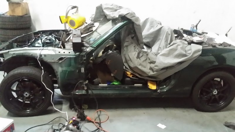 Time frame? If everything goes well (and I don't end up in divorce court), I hope to be rolling again in 6 weeks. The body will probably look like hell (let's see; BRG shell, silver doors, midnight blue trunk lid, black front fenders and hood...), I'll probably Plastidip it just to get through the winter, then paint it in the spring.