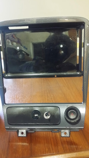 Here's the surround where the "ABS stuff" has been deleted and the start button and switch for the radiator fans are mounted. I'm going to drill another hole to the right of the start button and put an adjuster for the wiper delay there - probably will swap the start button and wiper delay around. Notice the hazard blinker switch in place of the cigarette lighter (I don't need no steenkin' lighter! I've got a 12v to USB converter behind the dash with 2 USB ports; 1 for the tablet power and an AUX port for my phone).