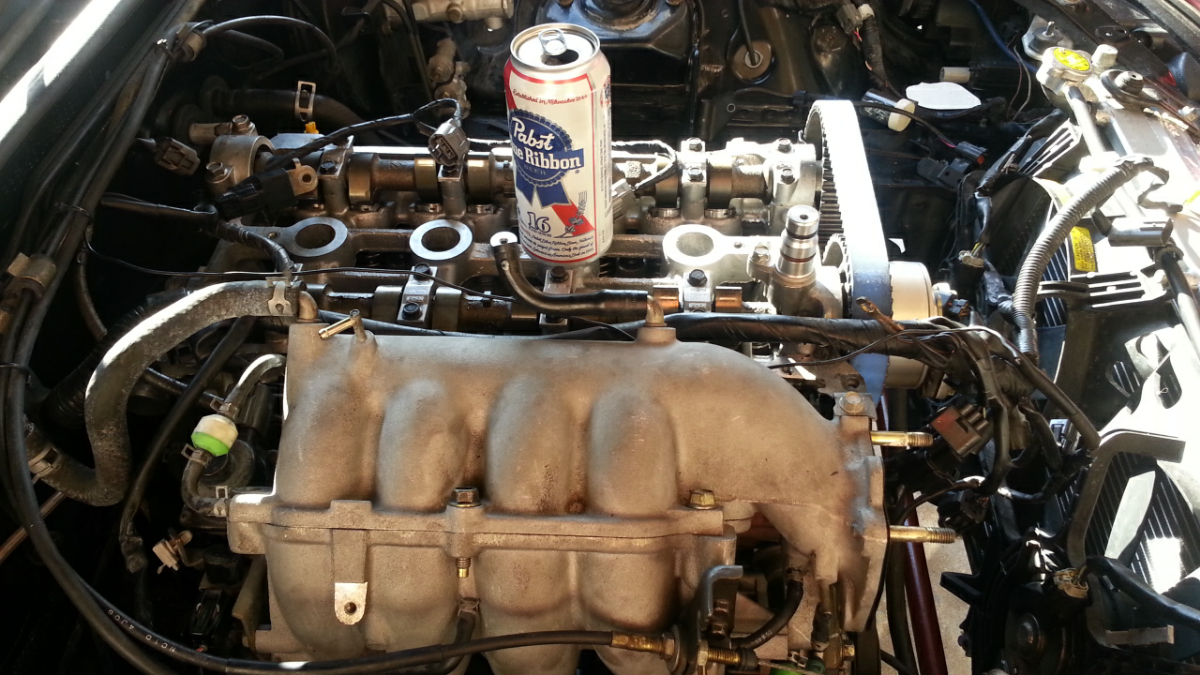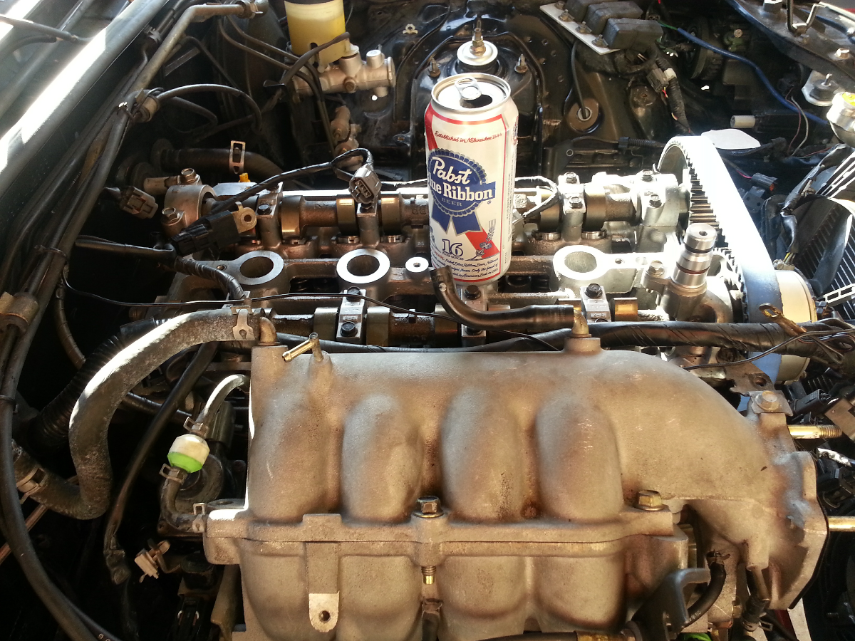 I just needed to remove two of the bolts on the block so that I could swing it into place and then bolt it back to the engine. Sixshooter decided to drop by and help me start bolting things back on. We noticed I forgot to attach the vvt oil hardline to the block. This became quite the challenge to put in place with the engine in and the intake manifold installed. Sixshooter so graciously took on this bitch of a project which seemed rather frustrating. Great success!
