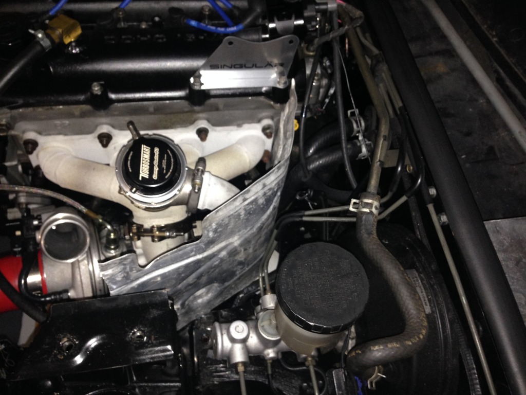 Sixshooter gave me some nice heat shield material from the junkyard that was double layered with an air gap and then he proceeded to make me an engine bay heatshield with it. It's not pretty but it will be very functional. I just need to finish the L-brackets to secure it.