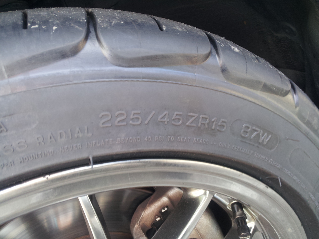 I still was unsure if I wanted to buy tires for them before the track day because I wanted to learn to drive on low grip tires so I would be traveling much slower when I lost traction and I would have more time to correct. Well then the plug that I used to repair the front left tire 15k miles ago failed. After talking to Sixshooter about tire selection he completely disregarded my notion of a performance tire with decent treadwear. His exact words were, "You can have a sticky tire or a tire with good treadware but not both." After a little more prodding and him basically telling me not to be a bitch I ordered a set of tires.