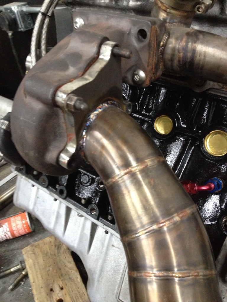 Teaser shot, I really disliked that spacer that I had to make to use that churbo. So I decided to cut the flange off and redo it. I took an inch off and re welded it with the right angle and rotation. It's all good, granted the welds aren't as pretty as they once were, I think I will survive.