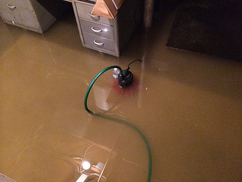 Here's my basement being drained by a 2nd sump pump; the main sump wasn't enough to stop a peak of 18 inches in the basement, upon which my brand new Sparco seats were floating. :(