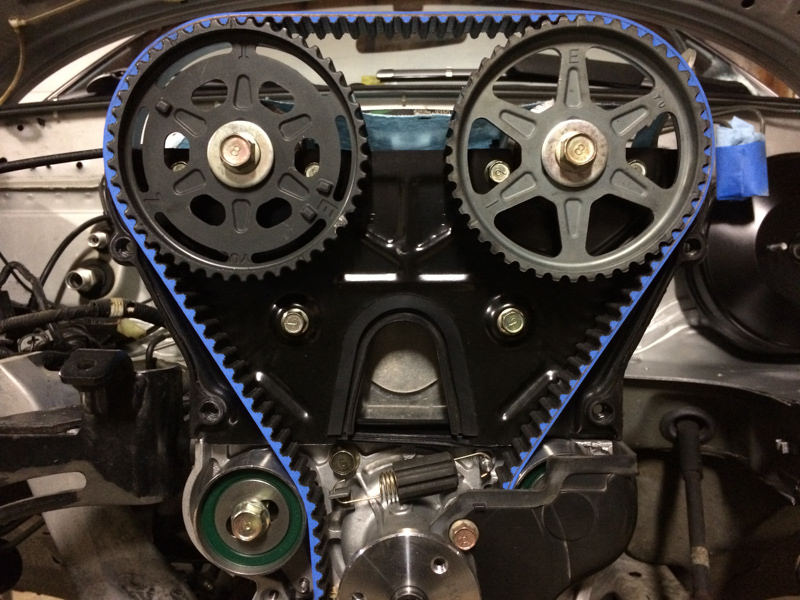 RYE_9251.jpg by Ryephile, on Flickr*Timing belt, idler pulleys, water pump, and TSE front water block-off w/freeze plug is all installed. You tell me if I got the cam gear alignment right, looks good on this side of the monitor.
