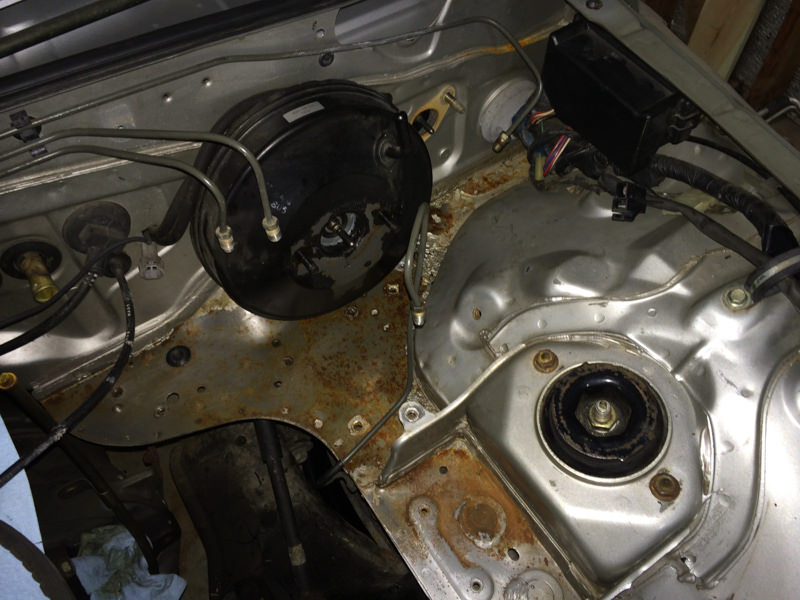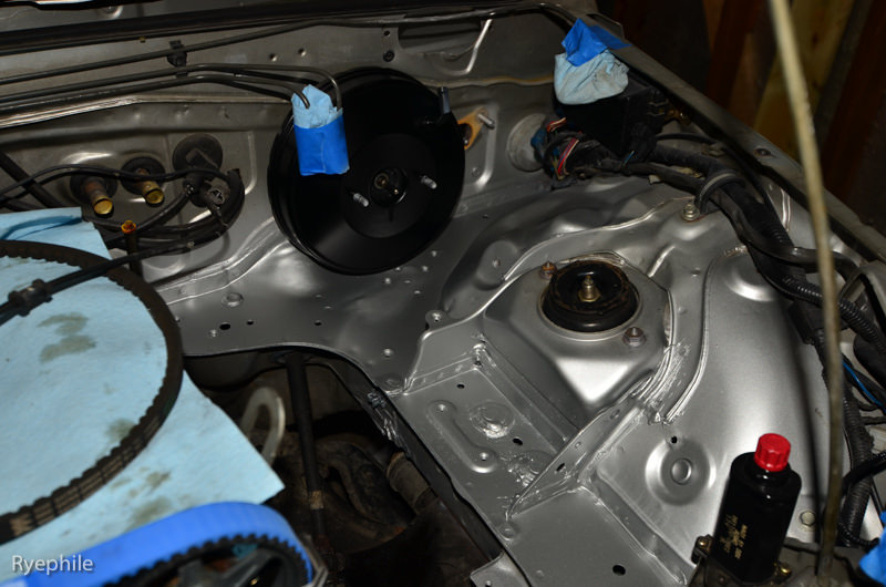 *Rust from leaking brake reservoir fixed. Wire brushed, sandpaper, 3-coats VHT Rust converter, 2-coats gray primer, 2-coats Mazda Silverstone Silver for the frame, and Mitsubishi Evo IX Tarmac Black metallic for the brake booster. No clear coat in the engine bay, just like stock.