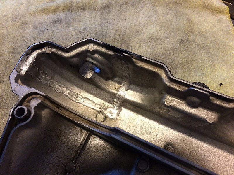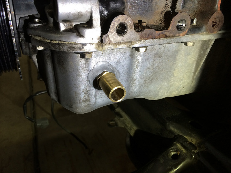 *Oil drain drilled and tapped using the 5 PSI PCV process. Aluminum shavings all up on my safety glasses. JB Weld High Temp used to seal the fitting.