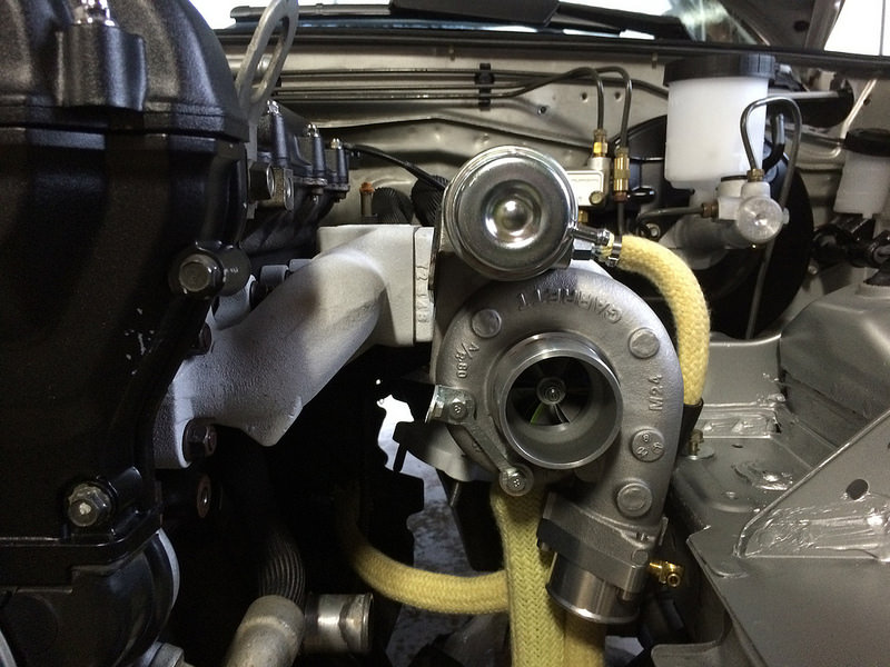 Turbo installed by Ryephile, on Flickr*Turbo assembly installed. I had to unbolt the driver-side engine mount and have helpers pull the engine to the passenger side to achieve sufficient clearance to put the manifold onto the studs. The heater hose hard line had to be nudged and bent to clear turbine outlet and FM heat shield. Heatshield products "Hot Rod" fiberglass sleeving used on all exposed portions of heater hoses, including hard line. Hot Rod sleeving within McMaster Kevlar/Fiberglass braid sleeving used on turbo oil and coolant lines. This is a killer combination for both radiant and blown-air heat resistance and internal thermal dissipation, according to my bench tests. The inboard water line is not yet installed. That'll happen eventually. The turbo will be fed from the intake manifold air valve coolant outlet.