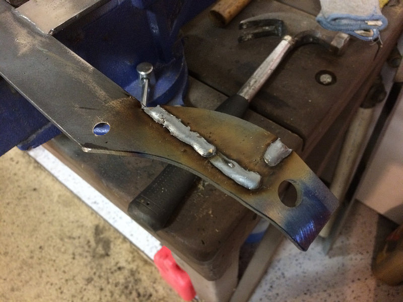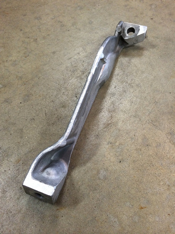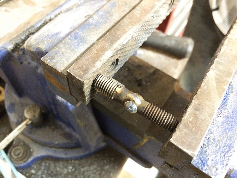 The Pegasus racing step-stud was close, the length and M8 was fine, but the M10 thread pitch was too coarse. So, I cut it in half, cut apart a fine-pitch M10, ground down the extra threads to match the M8 O.D., chamfered, clamped, welded, cleaned-up, and painted. This shot shows the first try, where my voltage settings were too low and I didn't get enough penetration. I did it right and now it's solid as a rock.