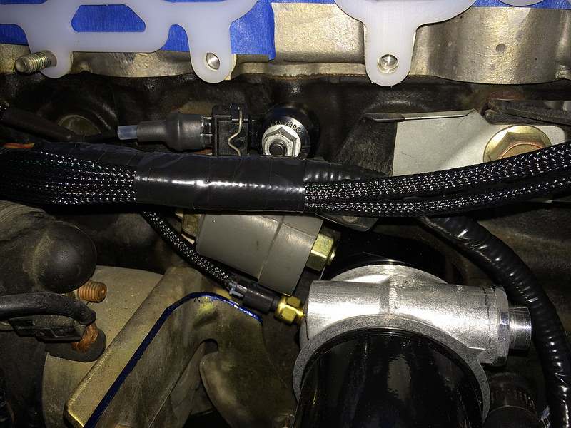 Sensor mounts by Ryephile, on FlickrHere's the finished loom on the passenger side of the engine, showing the Knock sensor mounted, along with the Mishimoto oil spacer plate with the OEM oil pressure and an AEM oil temp sensor, Mocal thermostatic plate, and then a Wix filter. I had to trim the starter bracket to make room for the oil temp sensor. Everything tucks in there nicely.