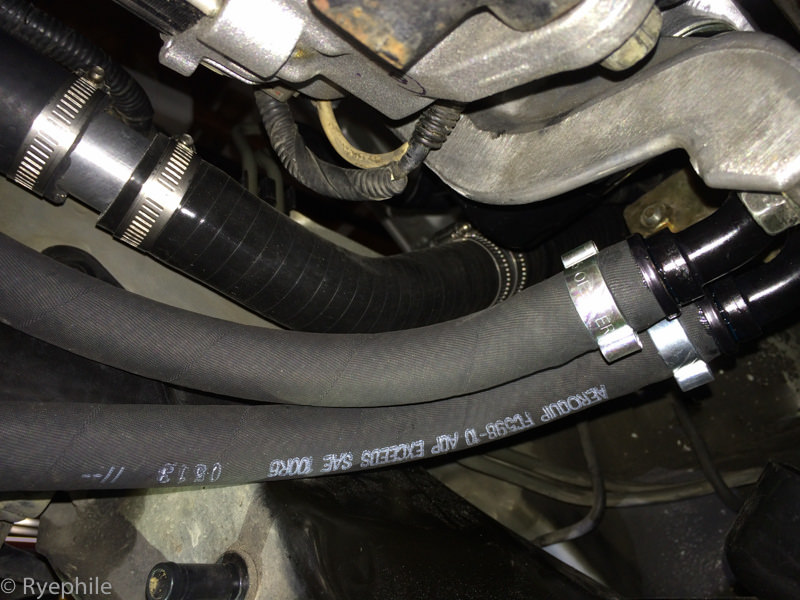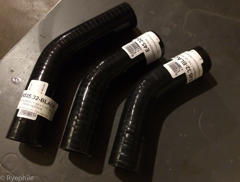 IMG_5155.jpg by Ryephile, on Flickr*Radiator upper hose made from 3 pieces of silicone from Pegasus Racing and a section from the Escalade OEM hose. 1 3/8 to 1 1/4 45 degree from the re-route Kia neck, followed by two 1 1/4 45 degrees down beneath the intake manifold and meeting up with the S section from the Escalade hose going to the radiator. Two 2" aluminum joiners and a 4" joiner needed. The entire hose length doesn't hit or rub anything, even accounting for engine movement and harmonic vibrations, something most aftermarket shops can't even understand. One of you tuning shops should be making this hose a 1 piece silicone product and sell the crap out of them, duh.