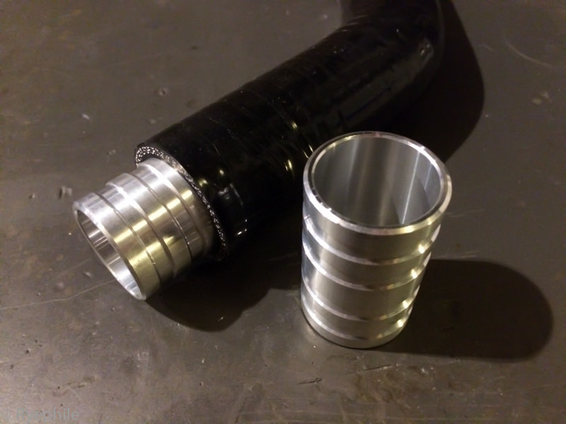 *Radiator upper hose made from 3 pieces of silicone from Pegasus Racing and a section from the Escalade OEM hose. 1 3/8 to 1 1/4 45 degree from the re-route Kia neck, followed by two 1 1/4 45 degrees down beneath the intake manifold and meeting up with the S section from the Escalade hose going to the radiator. Two 2" aluminum joiners and a 4" joiner needed. The entire hose length doesn't hit or rub anything, even accounting for engine movement and harmonic vibrations, something most aftermarket shops can't even understand. One of you tuning shops should be making this hose a 1 piece silicone product and sell the crap out of them, duh.