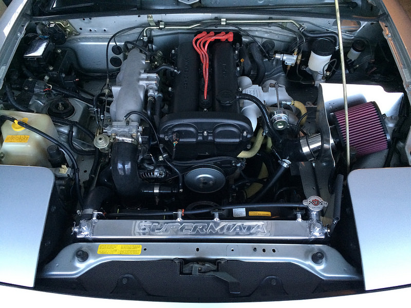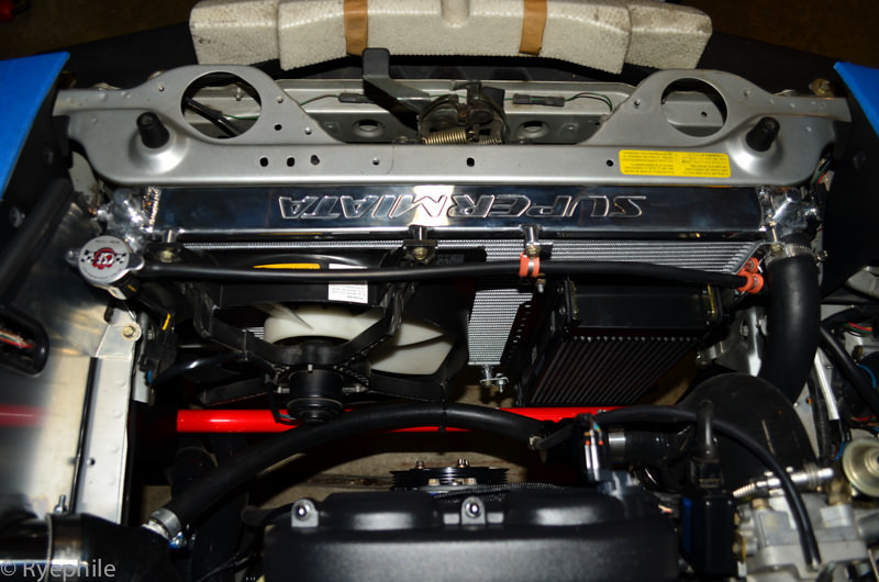...and a forward looking engine bay shot, showing the radiator, fan, oil cooler, and shiny red RB sway bar.