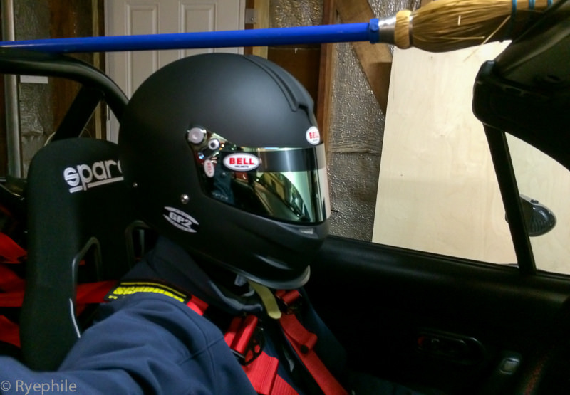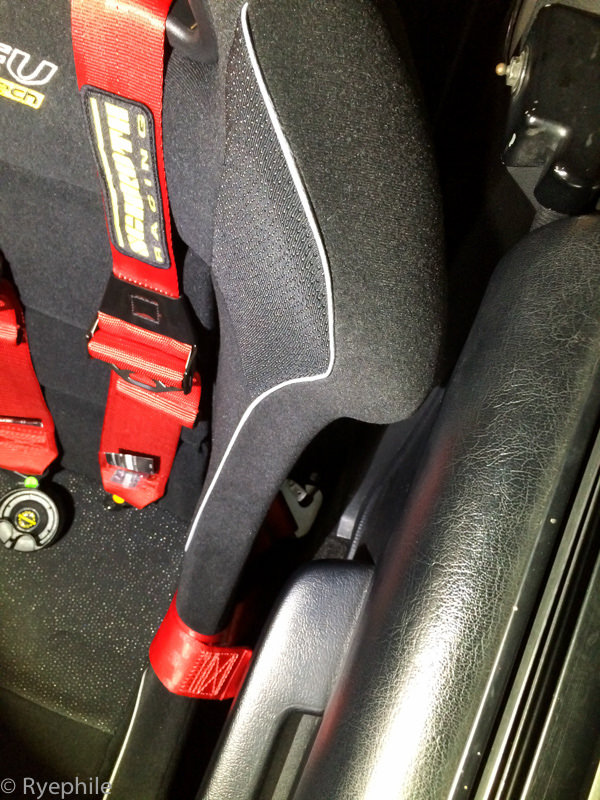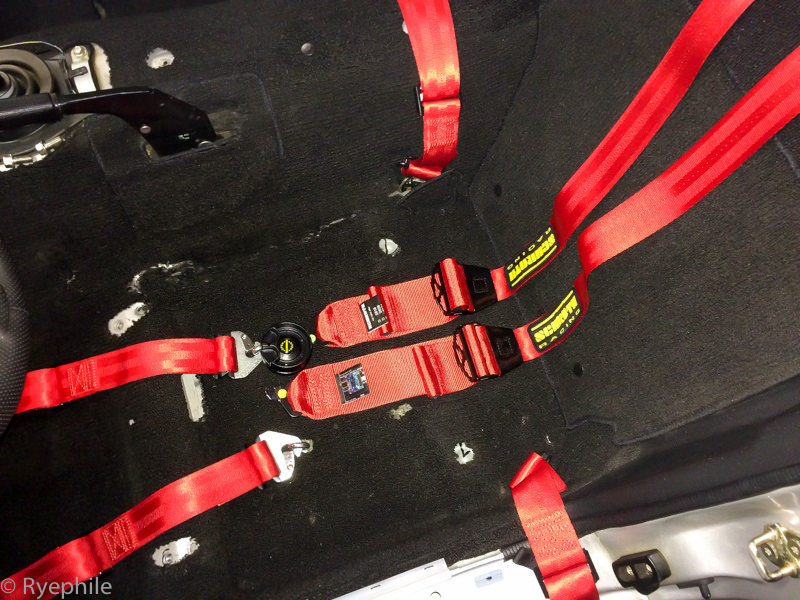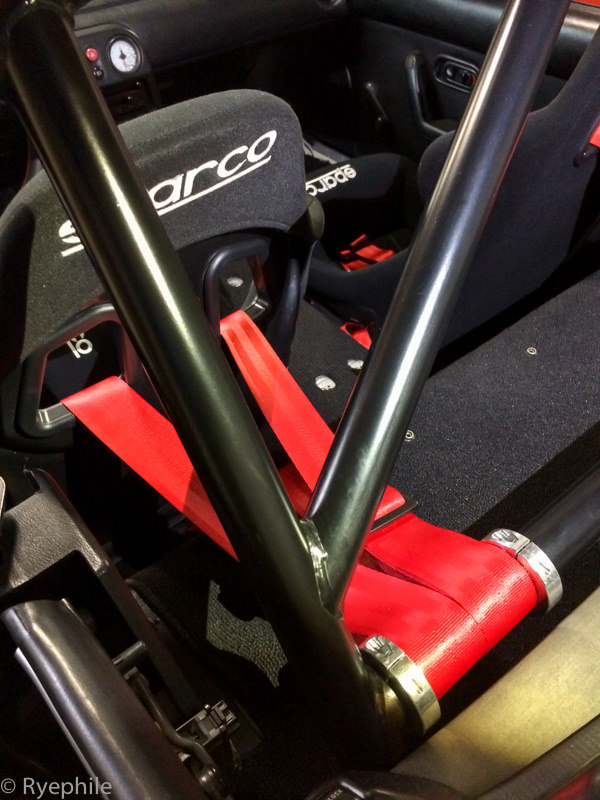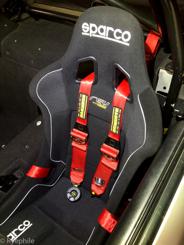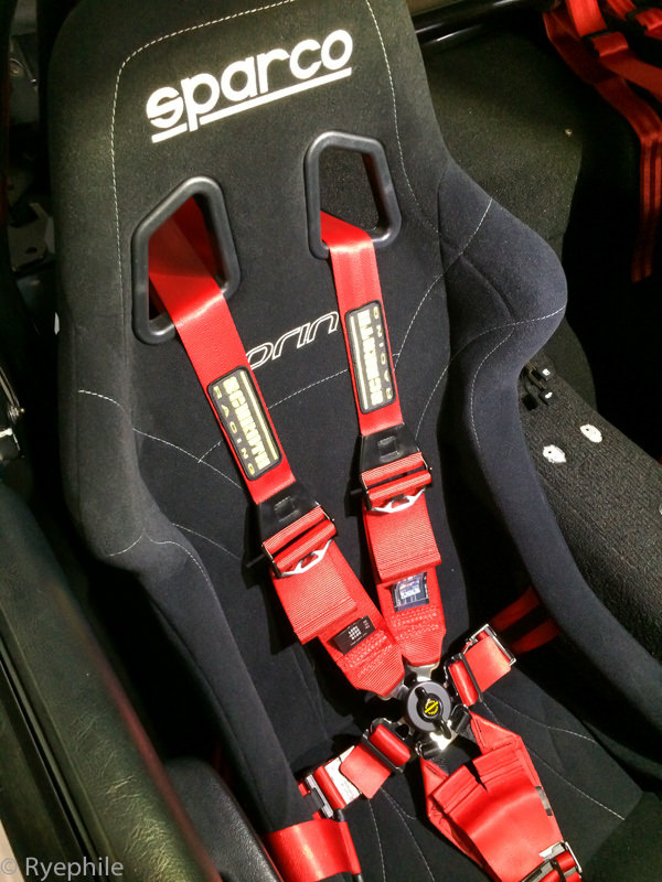 *Driver side: Sparco Rev, modified Sparco steel mounts, modified AWR rail, Schroth Hybrid II HANS 6-point harness [wrap around for shoulders, eye-bolts for lap and sub belts]