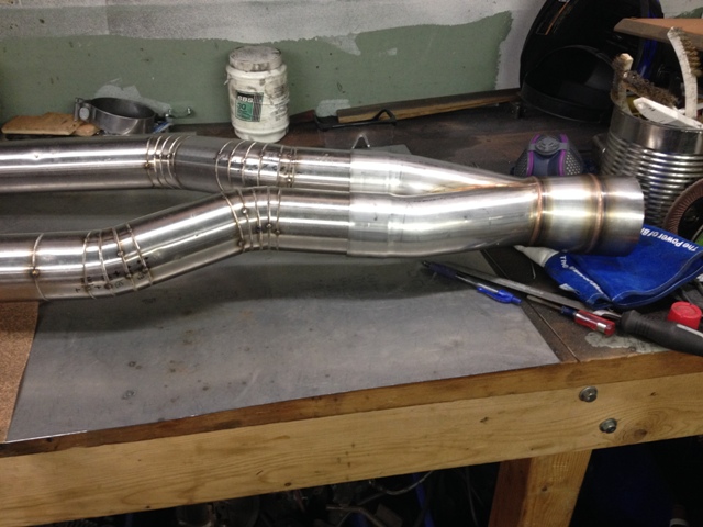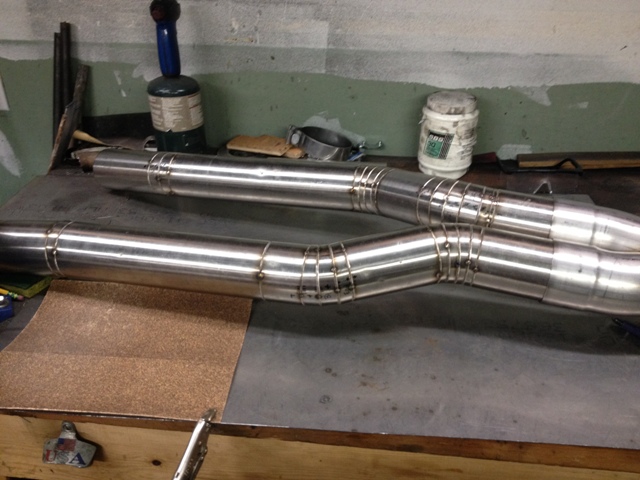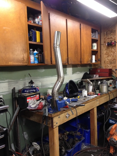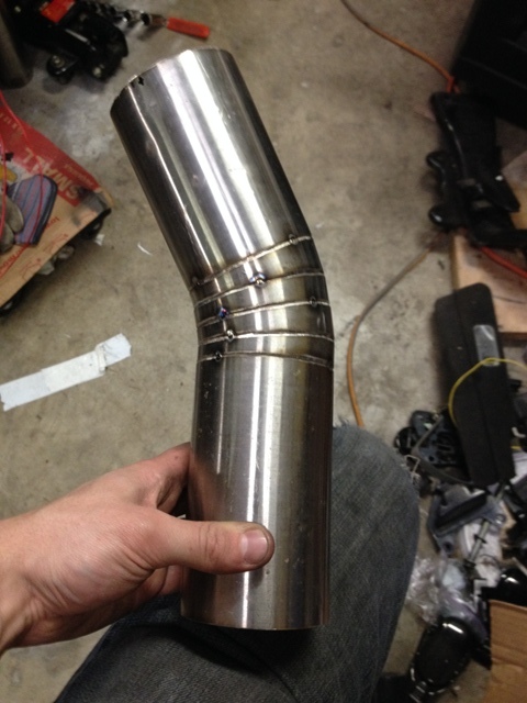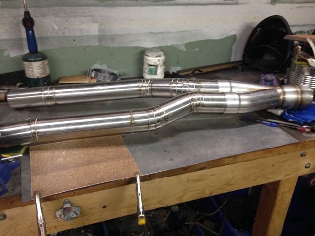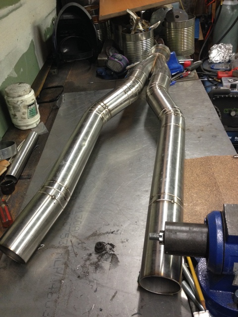 Spent a solid 15 hours in the garage yesterday, takes a reaaaaaaally long time to prep the cuts right but I'm about one cut away from being finished with the exhaust up to the y pipe. My strategy has been to duct tape everything together for the initial parts and then once the design is finalized to take it over to the bench and tack it up. Almost done tacking the passenger side, just need to do the rest of the pies in the picture. Then I need to make one more cut on the driver side to finalize everything and then that'll get tacked too. The last part is just the 4" which is the easy part, still need to re-do that 90 but other than that it's relatively simple and basically a straight shot other than that.